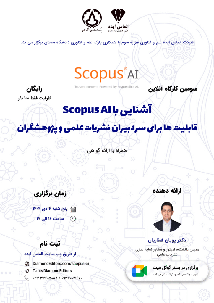 در این کارگاه خواهید آموخت چگونه ابزار هوش مصنوعی قدرتمند Scopus AI، با تلفیق محتوای معتبر علمی و فناوری هوش مصنوعی، فرآیند پژوهش را سرعت میبخشد، روندهای علمی را تحلیل میکند و به سردبیری و توسعه نشریات علمی کمک میکند. این کارگاه فرصتی ویژه برای سردبیران، هیئت تحریریه و پژوهشگران فراهم میآورد تا با کاربردهای عملی این ابزار آشنا شوند و نقش آن را در تسهیل دسترسی، تحلیل و ارتقای کیفیت نشریات علمی، به ویژه در فضای علمی ایران، کشف کنند.